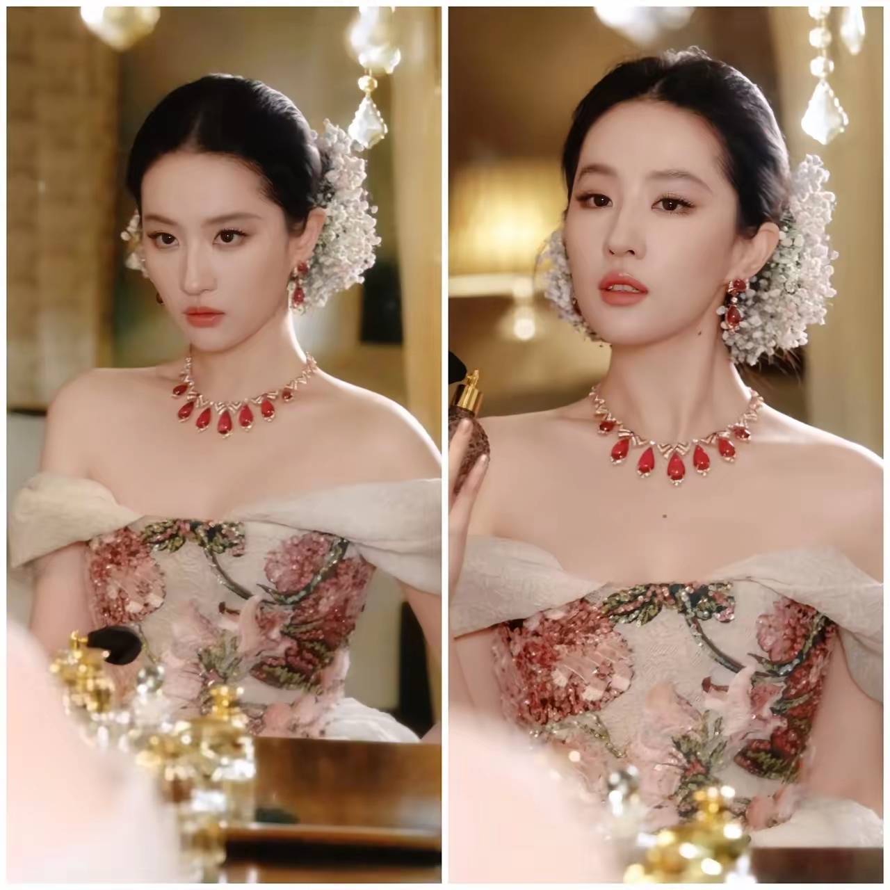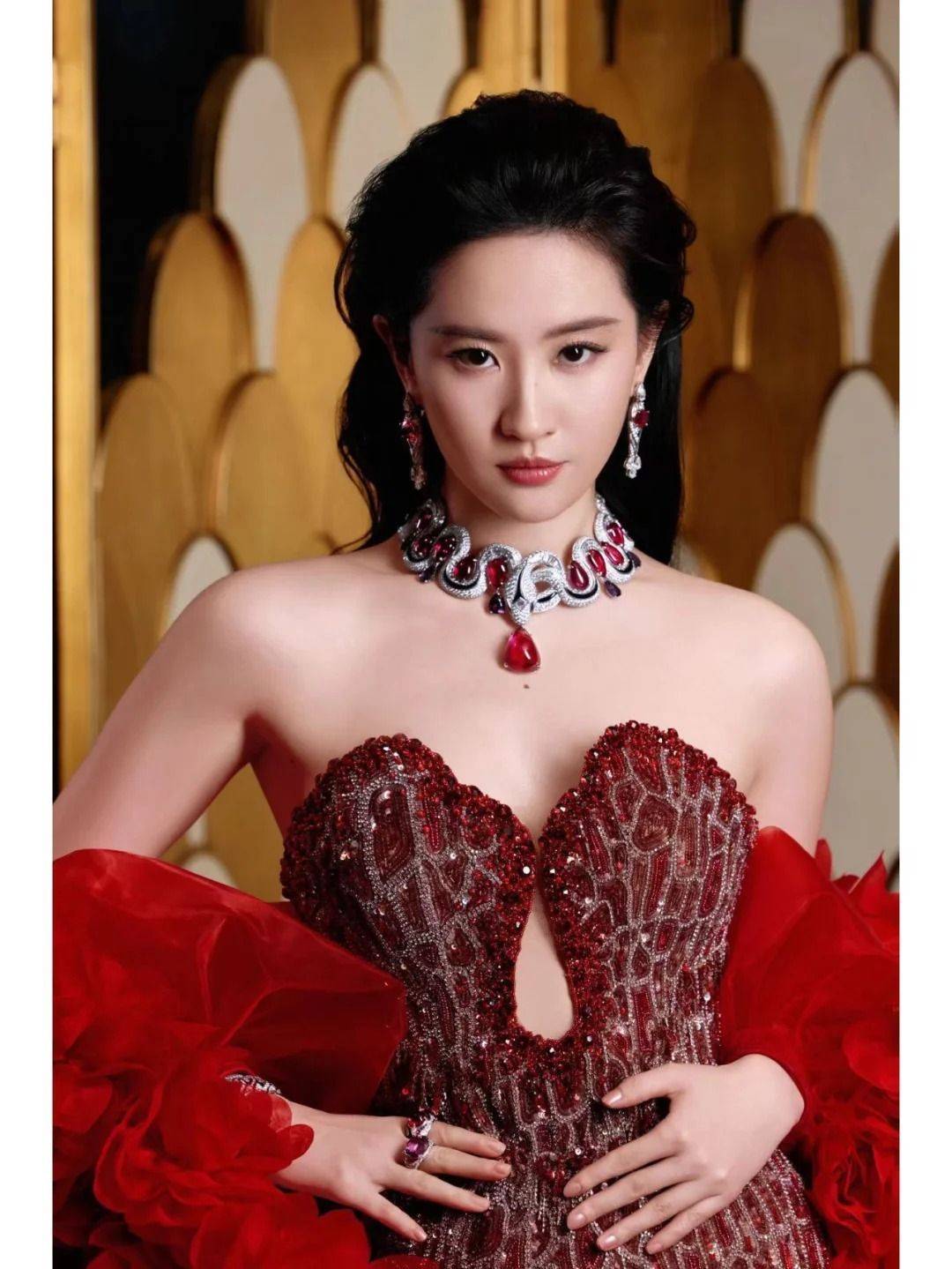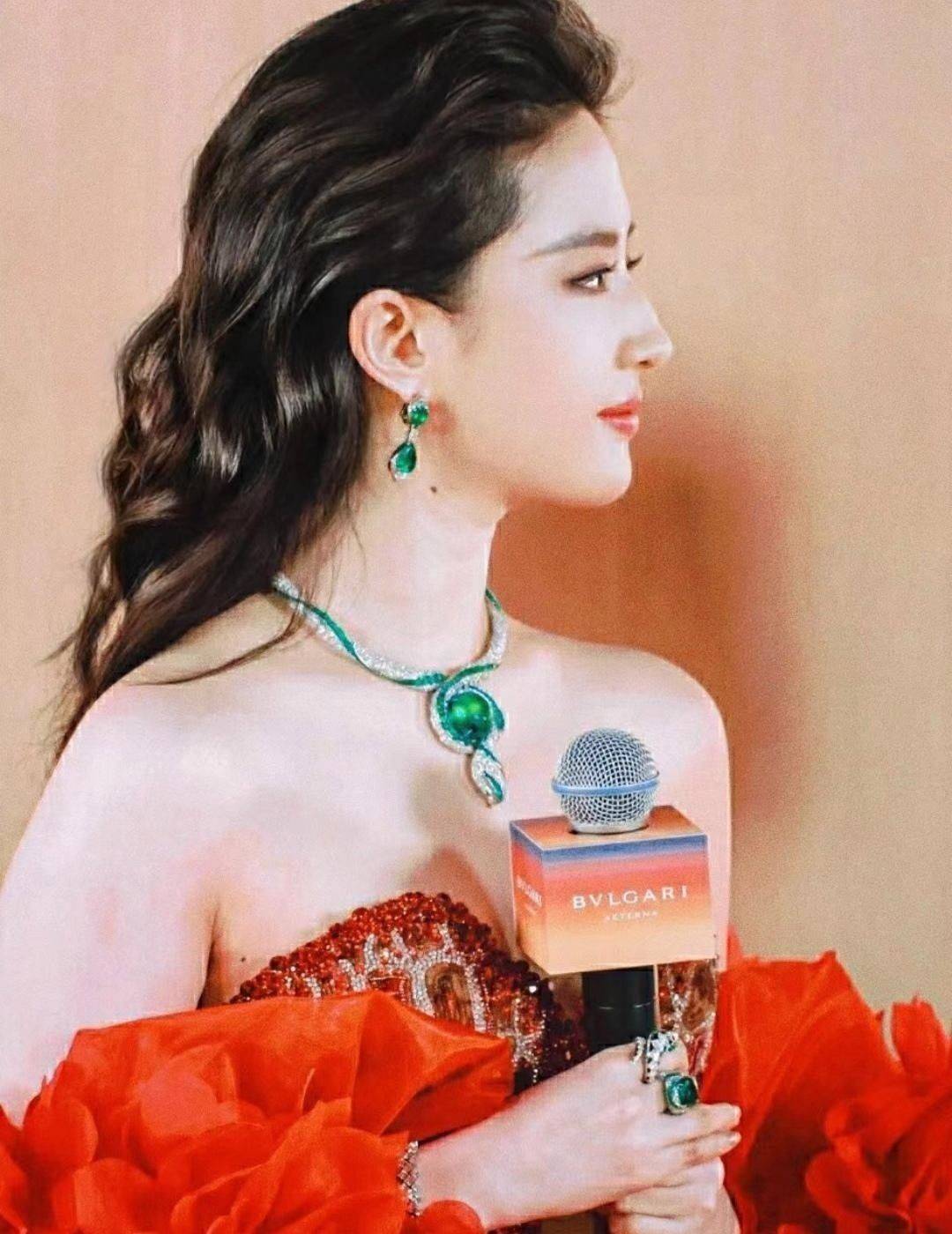 造型细节暗藏巧思:盘起的长发利落干净,宝格丽ECLETTICA系列帕拉伊巴碧玺项链与灵蛇戒指点缀其间,蓝绿色宝石与咖色礼服碰撞出华贵而不堆砌的高级感。有网友调侃:"不是珠宝不闪,是刘亦菲的气质太压场,连25克拉祖母绿都甘心退居二线。"