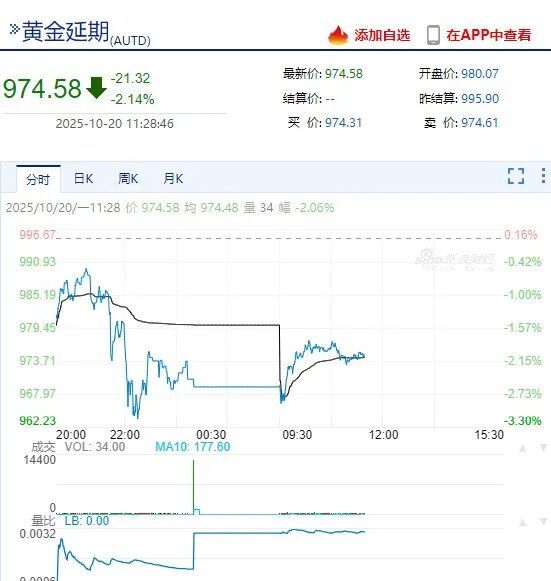 上海黄金交易所报价974.58元/克,跌2.14%。