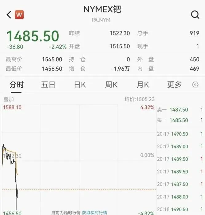 NYMEX铂金期货主力最新报1594.6美元/盎司,日内跌1.54%。NYMEX钯金期货主力最新报1485.5美元/盎司,日内跌2.42%。